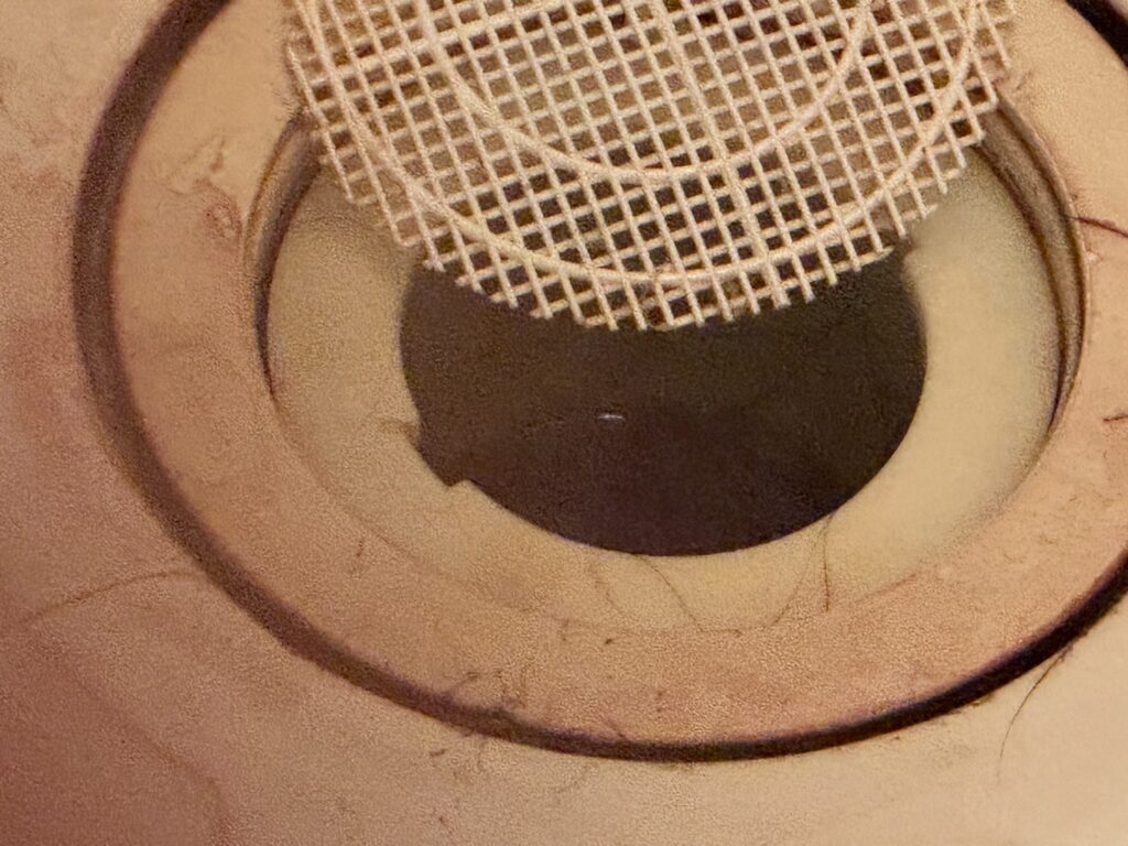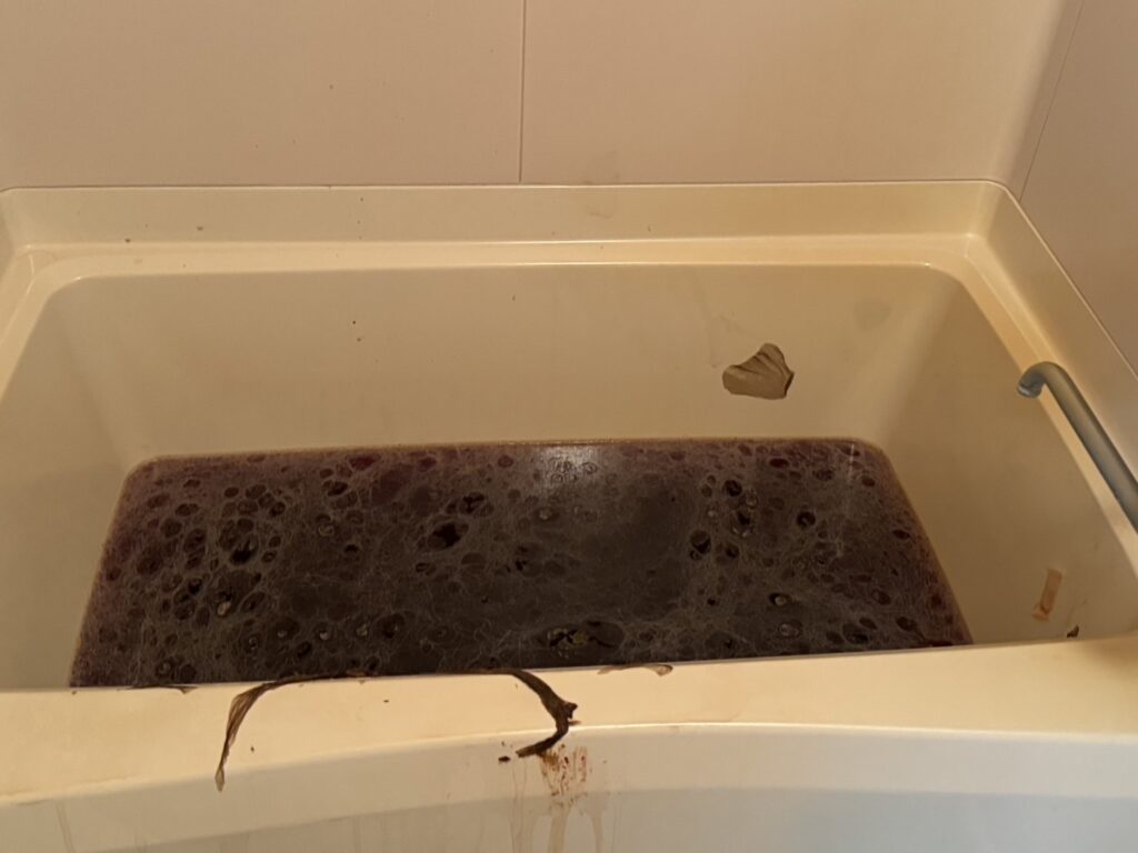 浴槽を覗き込むと、そこには濁りきった暗紫色の液体が溜まっていました。これは単なるお湯の汚れではありません。亡くなられてから発見されるまでの間に、ご遺体のタンパク質が融解し、水分と混ざり合ったものです。表面を覆う無数の気泡と膜は、細菌が活発に活動し、腐敗ガスを放出し続けていることを物語っています。