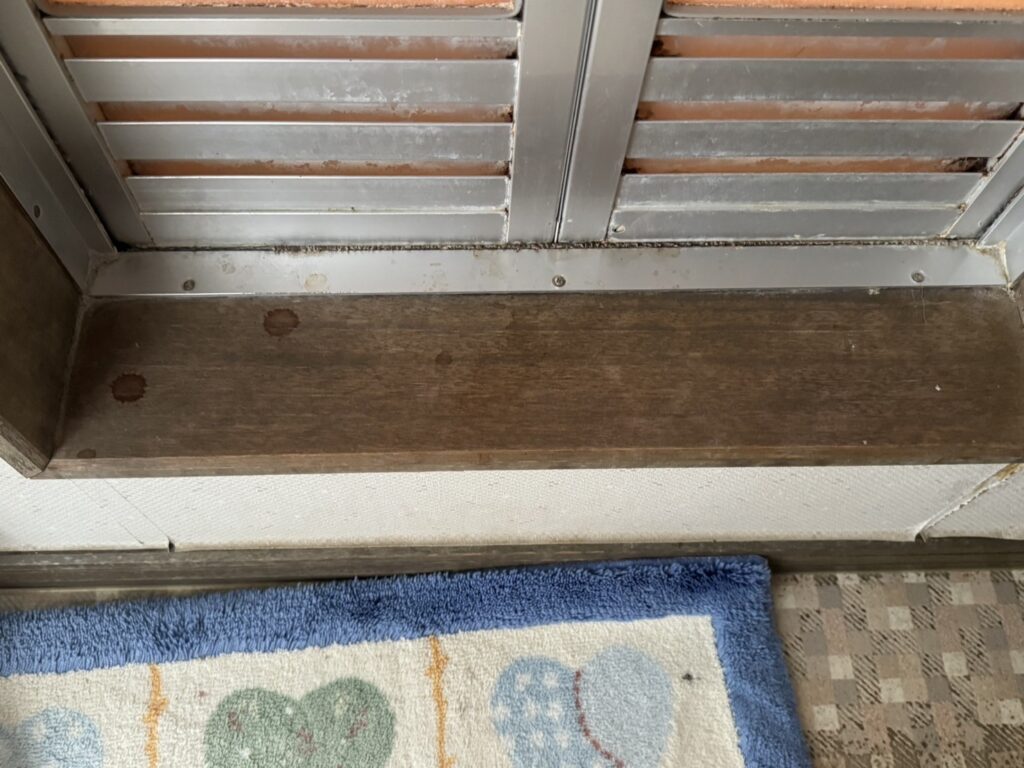 窓枠のサッシに目を向けると、そこにも体液の飛沫が点々と付着していました。ハエが汚染源から飛び回り、家中のあらゆる場所に病原菌を運んでしまった痕跡です。
