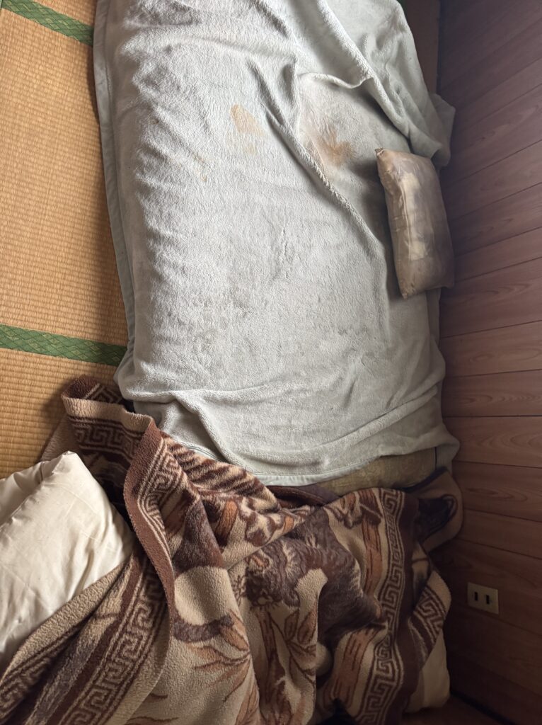 畳の上に敷かれた布団には、枕元に大きな茶色いシミが広がっています。亡くなる直前、体調を崩して横たわっていたのか、あるいは浴室で倒れる前にここで休んでいたのか。毛布の乱れ具合が、最期の瞬間の苦しさを無言で訴えかけてきます。