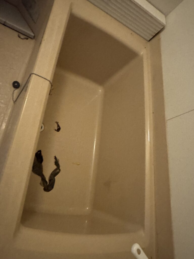 さらに目を落とすと、排水口には髪の毛がびっしりと詰まり、洗い場のタイルの隙間には赤黒い体液が染み込んでいました。 浴室での孤独死は、他の場所よりも凄惨な状況になりやすいのが現実です。水という媒体があることで腐敗のスピードは加速し、体液は排水設備を通じて階下や基礎部分へと浸透しようとします。