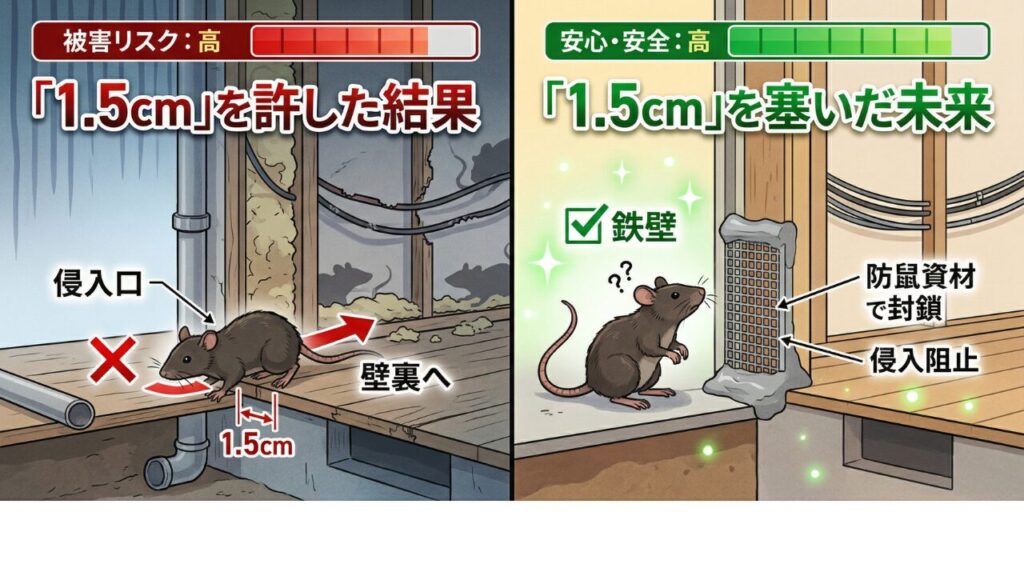 ネズミ駆除は、ある種の「根比べ」です。一箇所を塞ぐと、彼らは次の弱点を探します。しかし、家中すべての1.5cm以上の隙間が「金属と刺激物」で守られていると悟った時、彼らはその家を「住みにくい場所」と判断し、別の場所へと去っていきます。