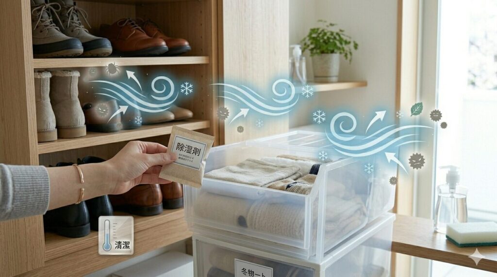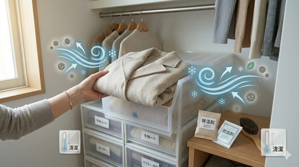 💡 プロのライフハック:収納ケースに「防虫剤」+「除湿剤」の黄金コンビ 防虫剤の成分は空気より重いため、ケースの「一番上」に置くのが鉄則です。さらに、今の時期は湿度が乱高下するため、除湿剤をセットで入れることでカビの発生を劇的に抑えられます。衣類を一生モノにするための、プロの基本ルールです。