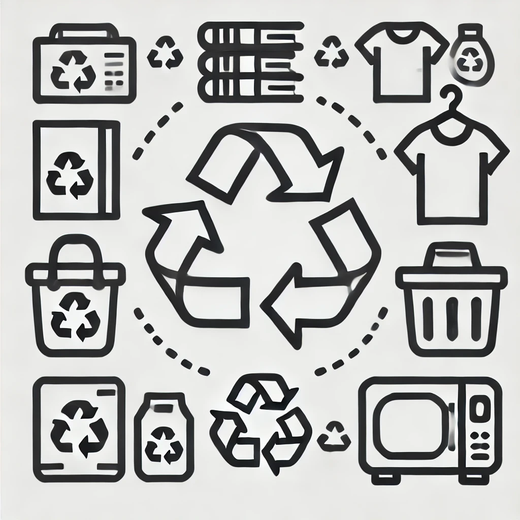 DALL·E-2024-09-09-11.04.39-A-minimalist-icon-representing-reusing-and-recycling-items-such-as-clothes-books-and-appliances.-The-icon-shows-arrows-in-a-cycle-around-these-items